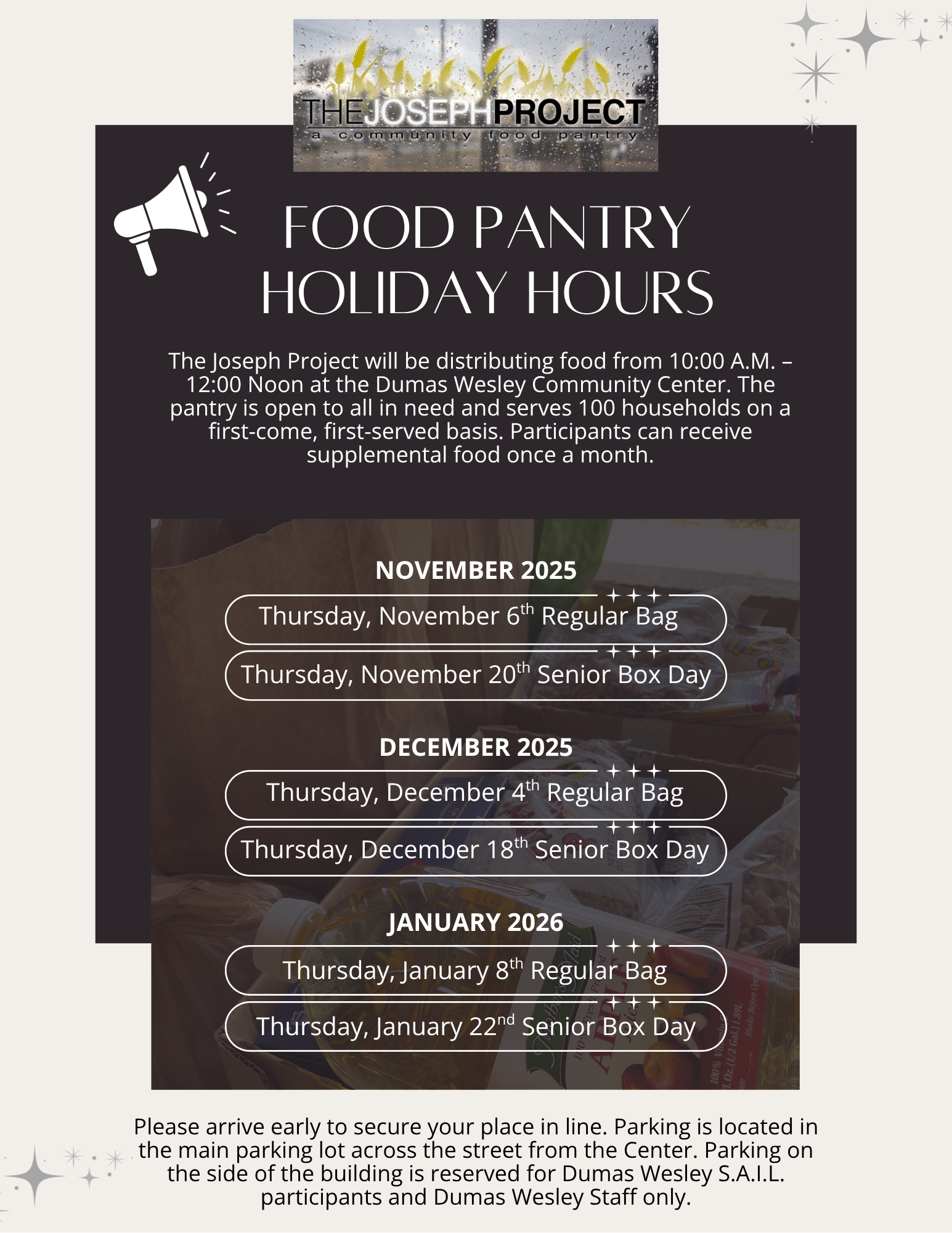 A community partner of the Dumas Wesley Community Center, The Joseph Project (TJP), named for the Joseph story in Genesis 41, is a mission of Ashland Place United Methodist Church. The food pantry is open to all in need and completely volunteer-supported and operated on the 1st and 3rd Thursday of each month. The food pantry is open from 10:00 A.M. – 12:00 Noon at the Dumas Wesley Community Center. The pantry serves 100 households on a first-come, first-served basis. Participants can receive supplemental food once a month.